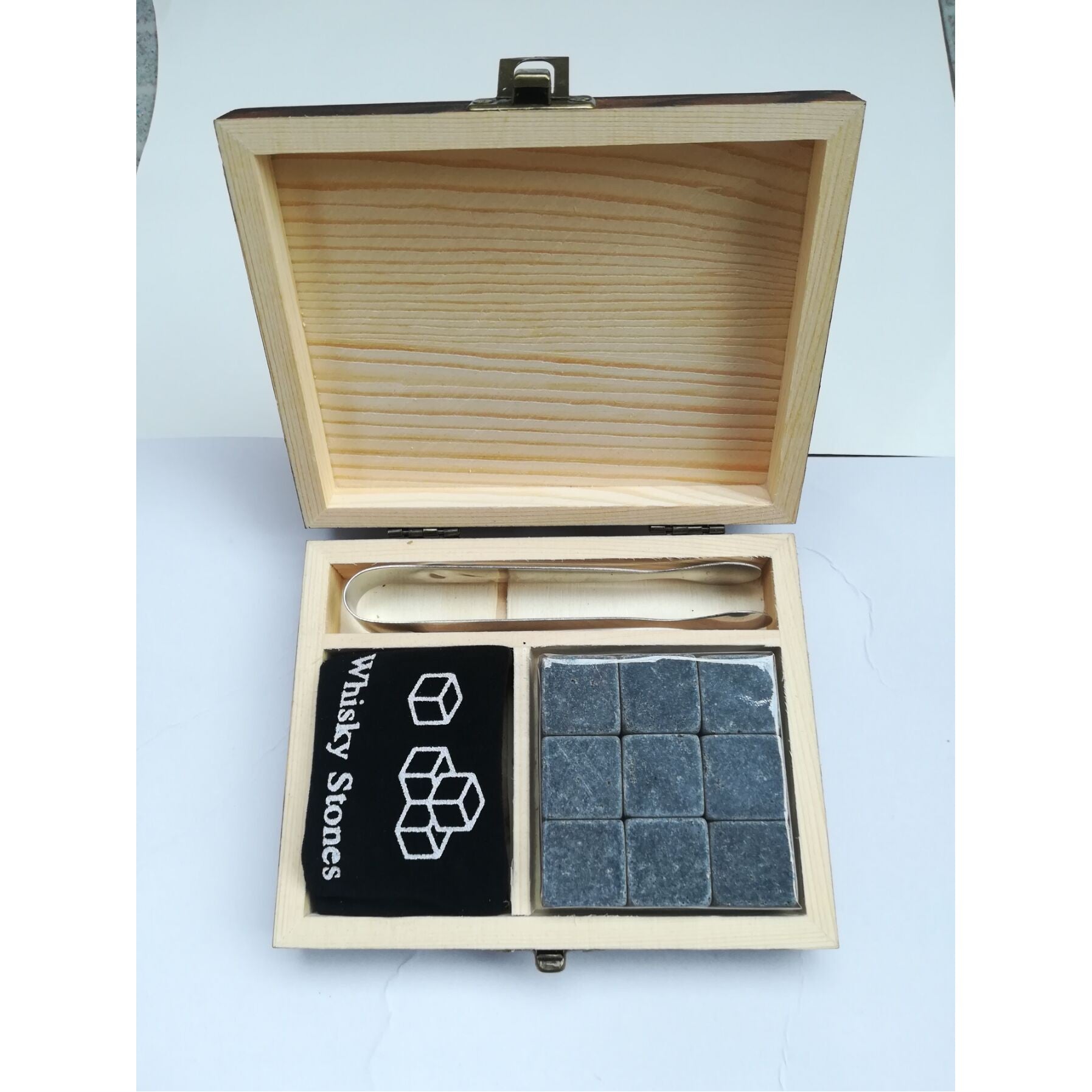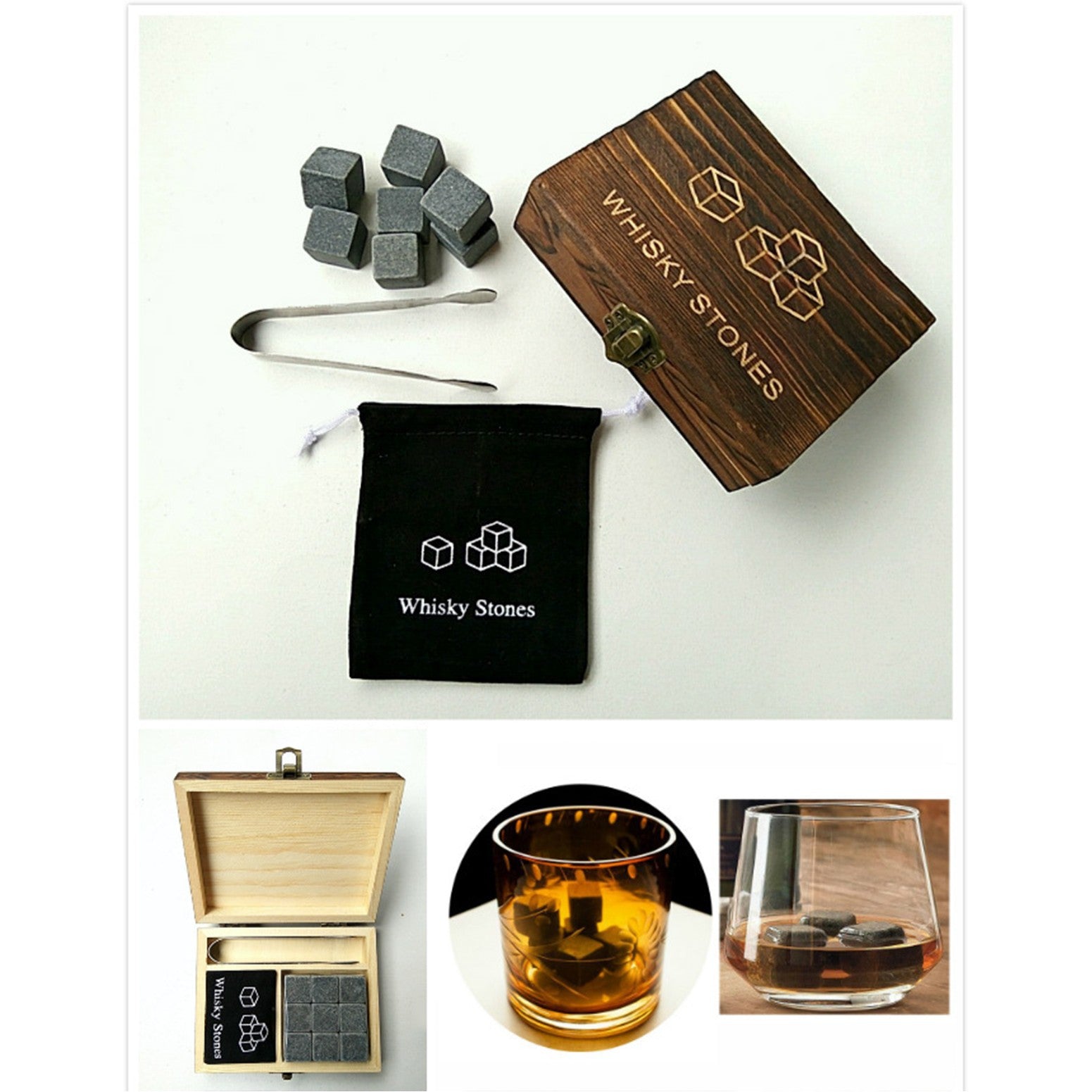 9 pcs granite stone ice cubes, one velvet stone packing bag, one stainless steel clip, one instruction, and one pine wood packing box. Laser imprinting on the wood packing box.